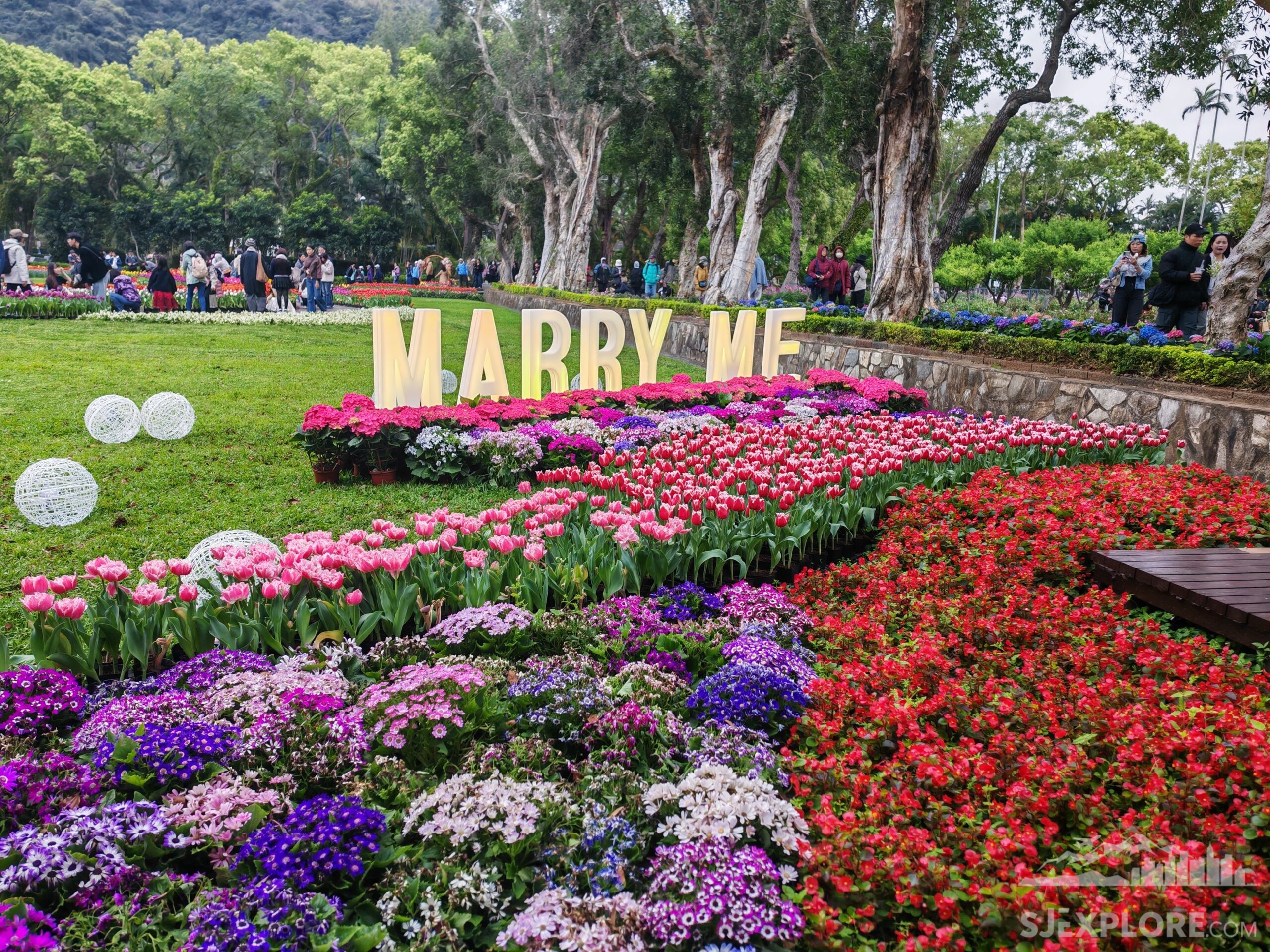 We followed the crowd and saw gardens filled with tulips. It was a sight filled with color and wonderful tulips – reds, yellows, violets, pinks, orange, and whites. More than 100,000 tulips, I heard, were flown in from the Netherlands and Japan to grace the Tulip Festival here in Taipei. We saw everyone had their cameras and cellphones out to record this delightful showcase of colorful tulip blooms. We saw an Instagram-worthy garden designed with a gigantic engagement ring and another garden with a huge “Marry Me” sign – so romantic, and rightfully so, because this year’s Tulip Festival theme is “Romance in Full Bloom.” Amazing!